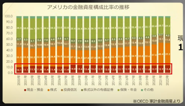 一方、ずっとインフレが続いているアメリカは、現金の割合が10%だとお話しさせてもらいました。