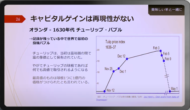 「チューリップの球根にどうやって付加価値を生み出すのか?」ということですけど、供給と需要のバランスが崩れると、そういうことが起こってしまいます。