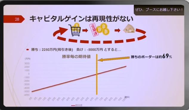 ビットコインが確率で分かりますので、繰り返す時にどれぐらいの期待値でやらないといけないのかですけど、69%ということになりますね。