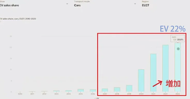 ヨーロッパのEVのセールスシェアは2017年から、このように増えています。