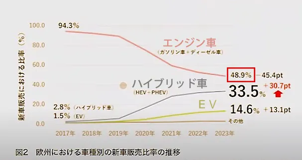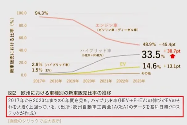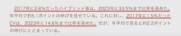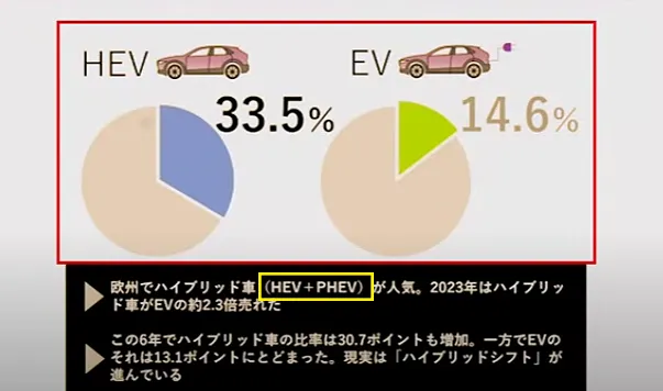 グラフもハイブリッドが33.5%、EVが14.6%となっていますが、説明部分にハイブリッド車(HEV+PHEV)と書いてあります。