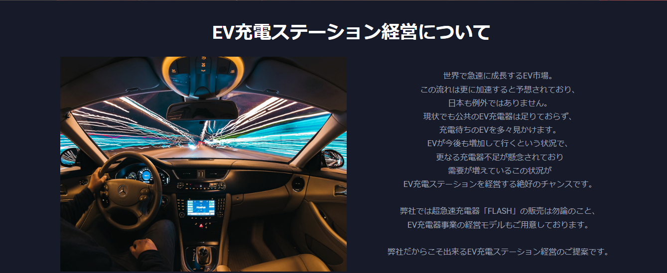 未来のエネルギービジネスへ、あなたと一緒に。 EV充電ステーション経営を始めましょう! EV市場の成長に伴い、EV充電器のニーズがますます高まっています。 そんなEV充電ステーション経営への参入・経営を弊社がサポートいたします。